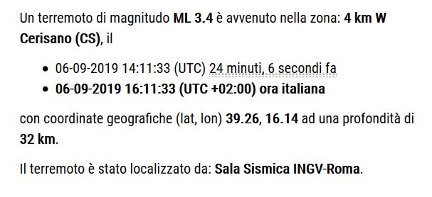 “Terremoto di magnitudo ML 3.4 del 06-09-2019 ore 16:11:33 (Italia) in zona: 4 km W Cerisano (CS)