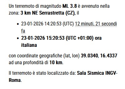 “Terremoto di magnitudo ML 3.8 del 23-01-2026 ore 15:20:53 (Italia) in zona: 3 km NE Serrastretta (CZ)