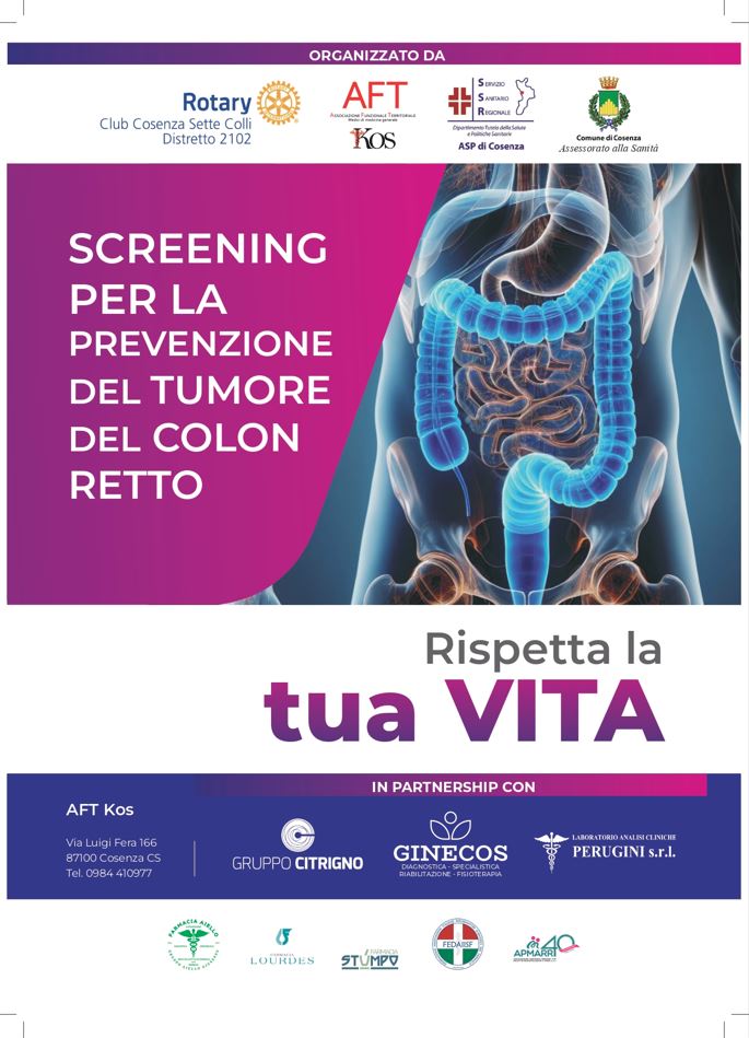 Rotary Club Cosenza Sette Colli, il Comune di Cosenza, l’ASP di Cosenza e l’AFT KOS, Gruppo Citrigno – Ginecos e laboratorio d’analisi Perugini promuovono lo screening per la prevenzione del tumore al colon retto.