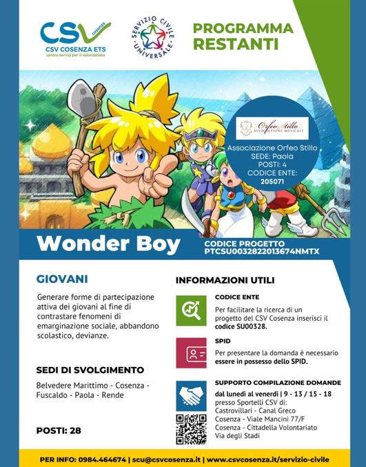 I giovani tra i 18 e 29 anni non compiuti, che ama ed ha competenze musicali, artistiche, di comunicazione, di grafica, etc. ma soprattutto curiosi, intraprendenti, responsabili, possono fare domanda per partecipare alle selezioni e diventare operatore volontario del servizio civile presso l’Associazione Musicale Orfeo Stillo, scegliendo il progetto “Wonder Boy”, codice ente SU00328, codice sede 205071, rientrante nel programma “Restanti” del CSV di Cosenza.