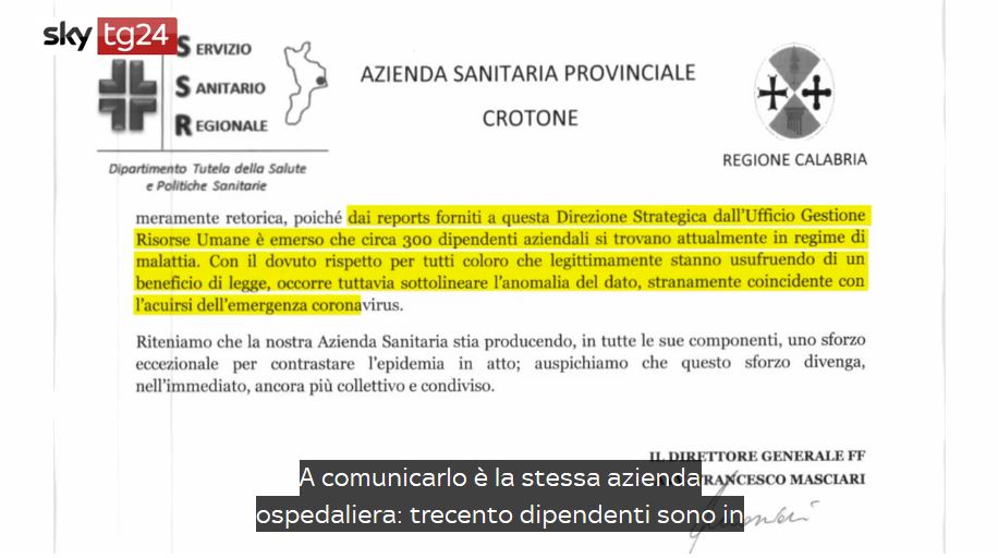 “È una cosa indegna, bisogna intervenire”. È così che Francesco Masciari, direttore generale facente funzioni dell’Asp di Crotone, commenta a Sky Tg24 questo dato: mentre la Calabria, come tutta Italia, combatte contro l’emergenza Covid-19, trecento dipendenti dell’Azienda sanitaria provinciale sono in malattia. “Con il dovuto rispetto per tutti coloro che legittimamente stanno usufruendo di un beneficio di legge, occorre tuttavia sottolineare l’anomalia del dato, stranamente coincidente con l’acuirsi dell’emergenza coronavirus”