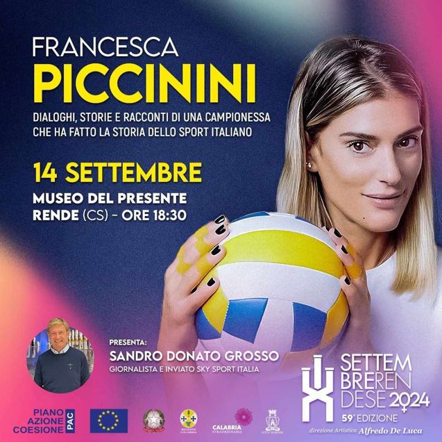Domani attesa Francesca Piccinini al Museo del Presente a partire dalle 18:30, una delle donne più vincenti dello sport italiano. L’ex pallavolista inaugurerà il festival,dedicato alla donna, con un incontro moderato dal presentatore ed inviato Sky Sport Italia Sandro Donato Grosso. “Un esempio di donna vincente che con il suo percorso agonistico ha fatto sognare intere generazioni” dichiara il direttore artistico De Luca.