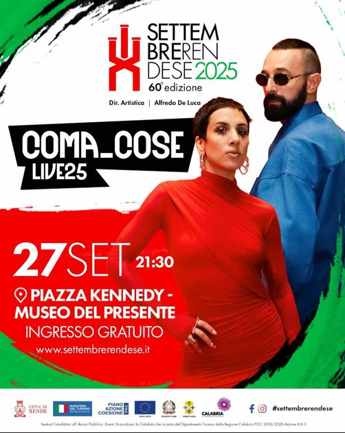Sabato 27 settembre il gran finale: attesissimo il live dei Coma Cose, il duo milanese reduce dal successo all’ultimo Festival di Sanremo con il brano Cuoricini. Il concerto, previsto in Piazza Kennedy (adiacente al Museo del Presente), si preannuncia come uno degli eventi clou dell’intera edizione, con un’affluenza di pubblico stimata in migliaia di presenze provenienti da tutta la regione.