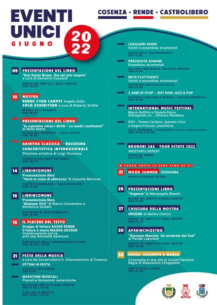 “Sulla scia della volontร espressa dai sindaci Franz Caruso, Marcello Manna e Giovanni Greco, indirizzata alla creazione di un organismo di pianificazione strategico ed integrato di funzioni e servizi nellโambito territoriale di Cosenza, Rende e Castrolibero, รจ stato dato vita al primo cartellone unico degli eventi estivi per il mese di giugno, che partirร proprio questa sera con la presentazione del libro di don Dante Bruno โ Dio nel mio respiroโ al Museo dei Brettii e degli Enotri.