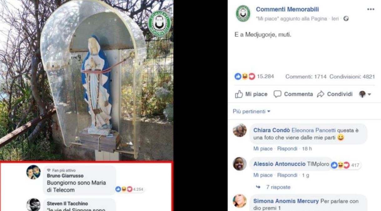 “«Buongiorno, sono Maria di Telecom», «le vie del Signore sono momentaneamente occupate, la preghiamo di riprovare più tardi», e così via, il tenore dei commenti è tutto su questa falsariga. E, d’altronde, non potrebbe essere altrimenti quando si uniscono una pagina Facebook che si chiama “Commenti Memorabili” e una Madonnina collocata in una cabina telefonica dismessa. “
