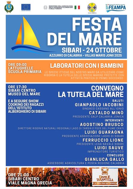 Alle ore 17:30, poi, al Museo del Mare di Sibari, si parlerà a trecentosessanta gradi di “Tutela del Mare” e di tematiche ad esso collegate nel corso di un convegno tematico che vedrà, dopo i saluti istituzionali del Sindaco di Cassano Gianpaolo Iacobini e Cataldo Minò, Presidente del Galp “Calabria Jonica”, vedrà gli interventi di Agostino Brusco, Direttore delle Riserve naturali regionali del Lago di Tarsia e della Foce del fiume Crati, Luigi Guaragna, Presidente dell’Associazione Laghi di Sibari, Ferruccio Lione, Presidente della Lega Navale sezione di Sibari e Luigi Sauve, imprenditore turistico. Conclusioni affidate all’Assessore all’Agricoltura e alla Pesca della Regione Calabria. A seguire, ancora, è programmato lo show cooking dei ragazzi dell’Alberghiero di Sibari dell’Istituto di istruzione secondaria superiore “Erodoto di Thurii”.