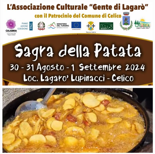 Quasi tutto pronto per la ventitreesima edizione della Sagra della Patata a Lagarò Lupinacci località nel comune di Celico; evento dedicato all’enogastronomia, in programma da venerdì 30 agosto fino a domenica 1 settembre.