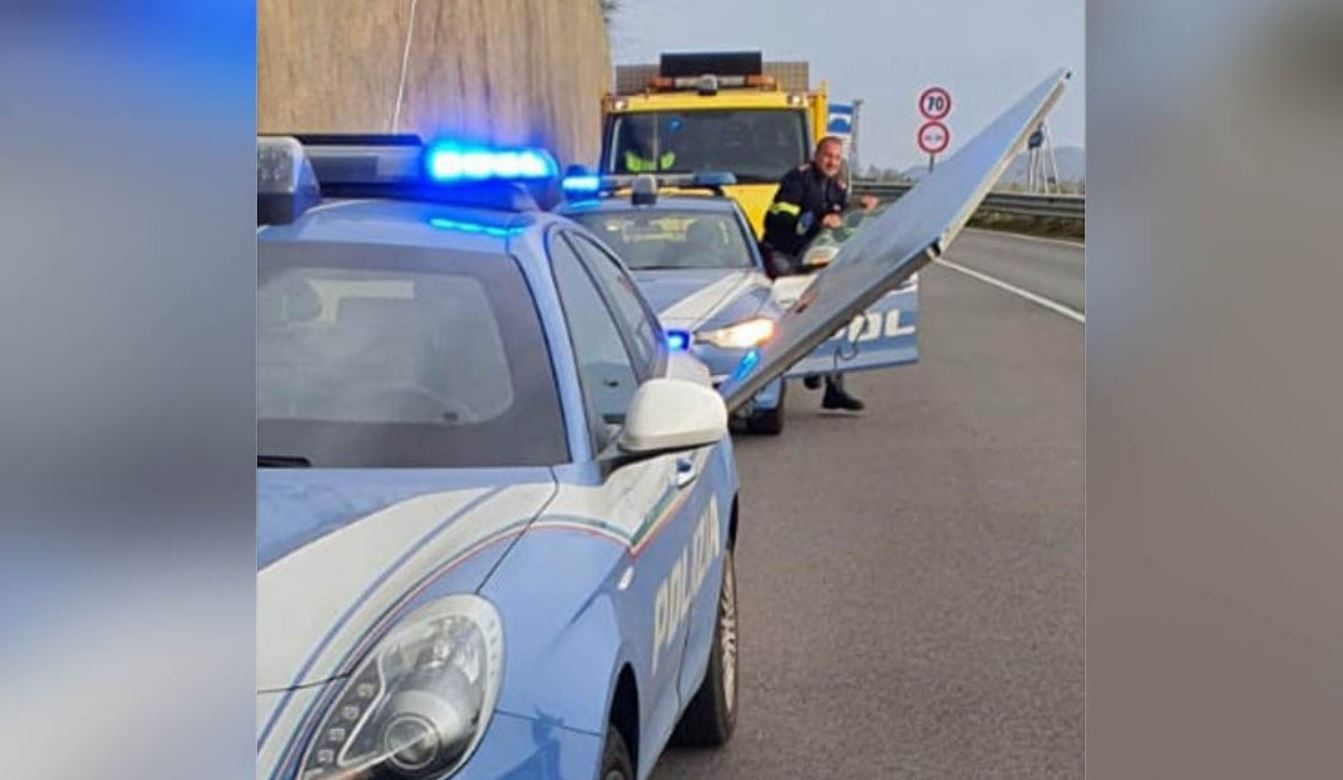 “Ad un certo punto, infatti, un portellone si è staccato da un autobus che precedeva l’auto della polizia ed è volato in mezzo alla strada. L’oggetto ha colpito la vettura della polizia su una fiancata conficcandosi all’interno della carrozzeria.”
