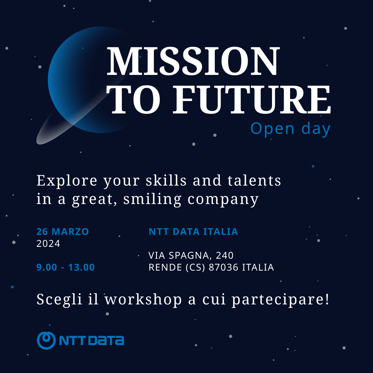 “Vieni a conoscere il nostro team di selezione al prossimo Open Day di Cosenza e inizia un percorso di carriera in NTT DATA”