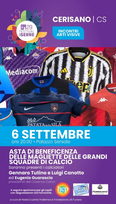 Nell’ambito del ricco cartellone del Festival delle Serre, l’asta delle maglie di calcio per supportare il reparto di ematologia dell’Annunziata di Cosenza.
