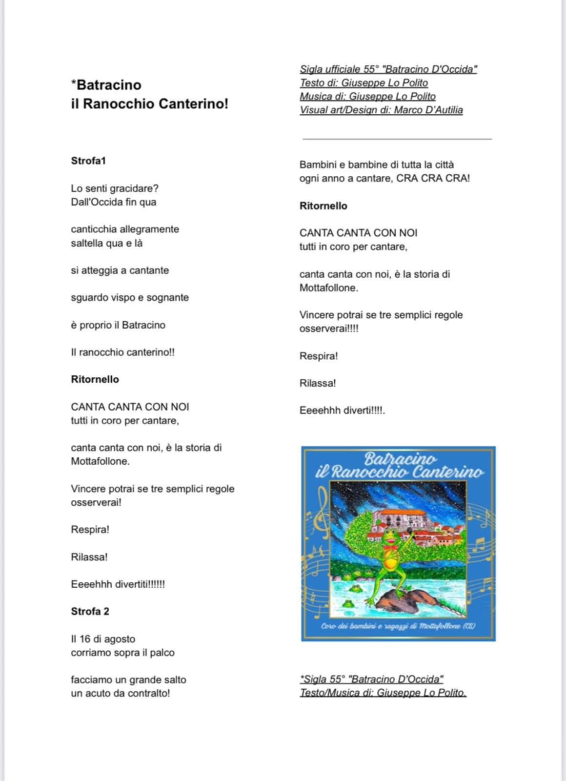 “Il 16 agosto alle ore 21,00, nella centralissima Piazza Indipendenza a Mottafollone, torna la 55° edizione del“Batracino d’Occida”; la gara canora per bambini e ragazzi che anima la serata più attesa dell’estate mottafollonese. La novità di quest’anno sarà l’apertura della kermesse canora con la Prima della sigla ufficiale, cantata dal vivo dai ragazzi e bambini del coro di Mottafollone.