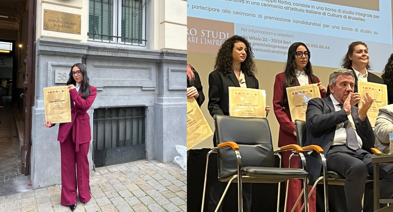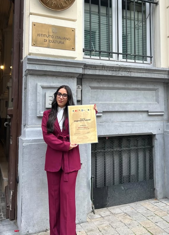 A lei, per i suoi meriti e successi accademici, durante la cerimonia di premiazione presso l’Istituto Italiano di Cultura di Bruxelles, è stato conferito il premio “Imprese e Talenti” ed è stata offerta una borsa di studio per frequentare il Master in International Marketing, Eventi & Media.