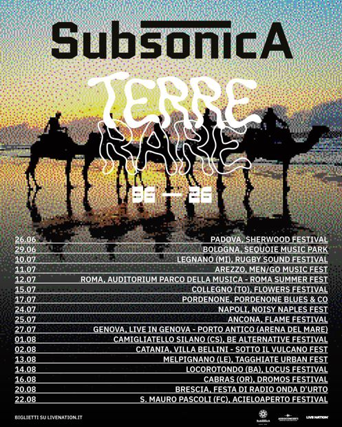 I Subsonica annunciano “TERRE RARE 96-26”, il tour nei principali festival estivi italiani in partenza il 26 giugno. I biglietti saranno disponibili a partire dalle ore 12:00 di venerdì 20 febbraio su www.livenation.it e in tutti i punti vendita autorizzati e su Ticketmaster, TicketOne e Vivaticket.