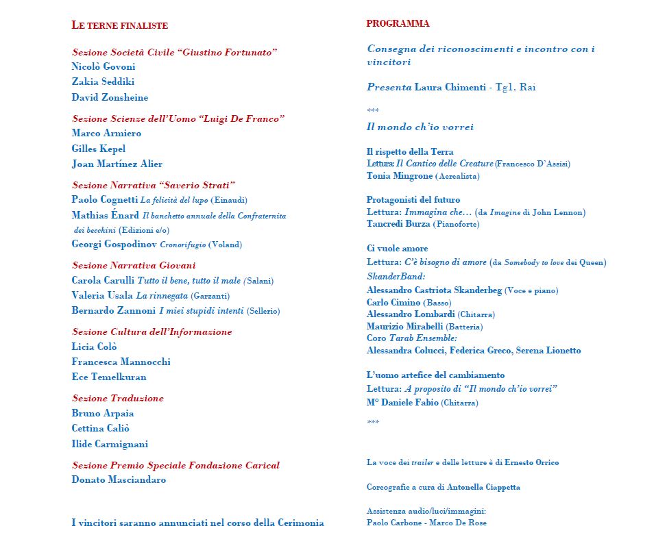 Alla presenza di numerose personalità del mondo della letteratura, dell’informazione e dell’impegno civile, saranno proclamati i vincitori tra i finalisti delle sezioni in concorso. Queste le terne finaliste della XVI edizione: