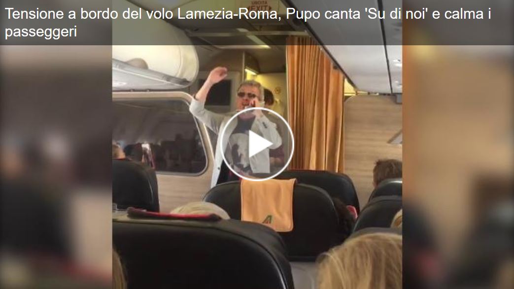 ““Su di noi nemmeno una nuvola…”, cantata da Pupo in persona, e torna il sorriso. Attimi di tensione su un volo Alitalia da Lamezia Terme a Roma, pieno di turisti francesi di ritorno da una vacanza a Pizzo Calabro, inferociti per un disguido della compagnia italiana riguardante diversi errori sui posti assegnati.”