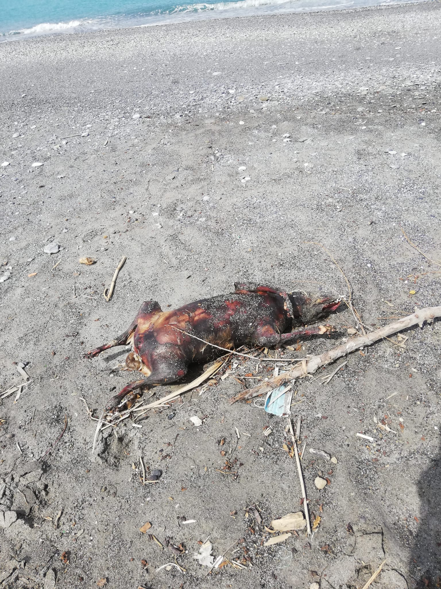 Era quello che restava di uno sfortunato cagnolino, senza collarino, poteva essere una taglia piccola/media, aveva delle chiazze sul corpicino che lasciavano pensare a bruciature…la scena era veramente scioccante.