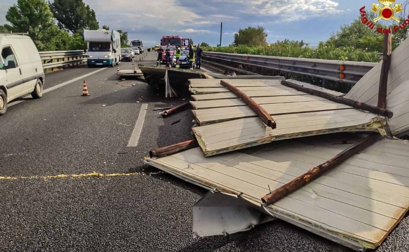 “L’ondata di maltempo e il forte vento che hanno investito questa mattina il Cosentino ha causato il distaccamento della tettoia di uno stabilimento adiacente l’autostrada A2 Salerno-Reggio Calabria. Le lamiere sono finite sull’asfalto della corsia sud tra Torano e Mongrassano.”