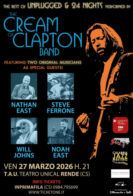 In occasione dell’attesissimo concerto rendese, targato Calabria Jazz Meeting e organizzato in joint venture con la XXV edizione del Peperoncino Jazz Festival diretto da Sergio Gimigliano con il patrocinio dell’Area Socialità dell’Università della Calabria e con l’importante supporto logistico del Best Western Premier Villa Fabiano Palace Hotel, ospitato nello splendido Teatro Auditorium dell’Unical grazie alla fondamentale collaborazione con Dedo Eventi e con il Rende Teatro Festival diretto artisticamente da Alfredo De Luca, a tutti gli studenti dell’Unical che ne faranno richiesta l’organizzazione riserverà convenzioni speciali, con la possibilità di acquistare i biglietti (in vendita online su Ticketone al link https://www.ticketone.it/event/the-cream-of-clapton-band-teatro-auditorium-unical-tau-21298274/) ad un prezzo ridotto.