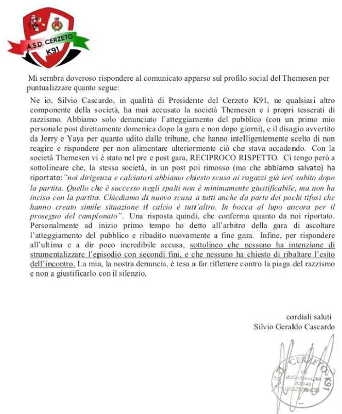 “A mente fredda il presidente del Cerzeto K91 Silvio Cascardo, si dice pentito di non aver ritirato la squadra dal campo. «Meglio perdere tre a zero a tavolino che continuare a sentire le ingiurie razziste rivolte da bordo campo verso due ragazzi di colore in forza alla propria compagine» dice riferendosi al match disputato nel campo sportivo di Longobucco nell’ultima domenica di campionato, quella del 28 gennaio scorso.