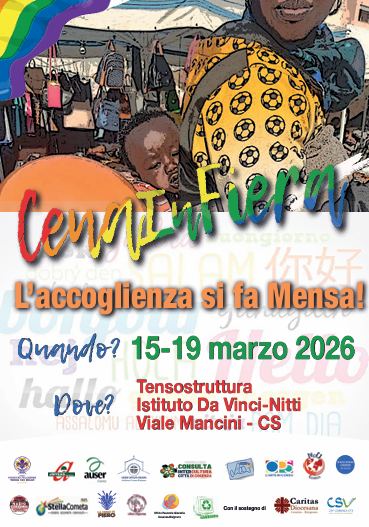 Il messaggio del comitato promotore di CenaInFiera (Agesci, Anteas, Associazione Culturale Verde Binario ETS, Auser Cosenza, Consulta Intercultura Cosenza, Azione Cattolica Cosenza-Bisignano, Fondazione Lilli, MOCI Cosenza, L’arte in corso APS, Spazio Donna-MoCI, Stella Cometa, Terra di Piero, Ufficio Migrantes Cosenza-Bisignano, Ufficio di Pastorale giovanile CS, con il sostegno di Caritas Diocesi di Cosenza-Bisignano, CSV Cosenza) attraversa la Fiera e arriva al cuore della città coinvolgendo scuole, cittadini, attività commerciali e imprese: condividere un pasto significa condividere l’umanità.