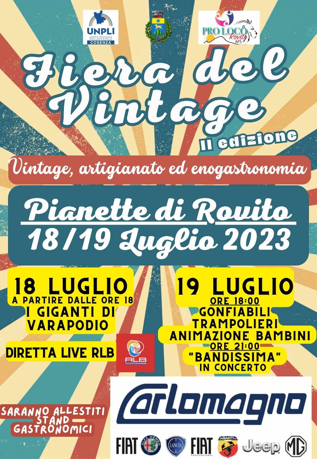 Al via domani, martedì 18 luglio, a Pianette di Rovito, la seconda edizione della «Fiera del vintage, artigianato ed enogastronomia», la due giorni promossa ed organizzata dalla Pro Loco di Rovito con il patrocinio dell’Amministrazione Comunale.