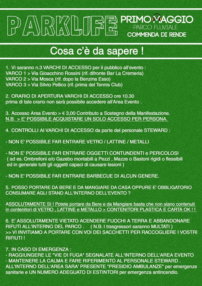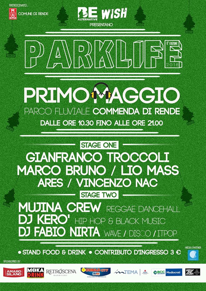 Parklife 2018 – #PrimoMaggio – 6°edz. – Martedì 1 Maggio – dalle ore 10.30 alle ore 21.00 – Parco Fluviale Commenda di Rende (CS)”