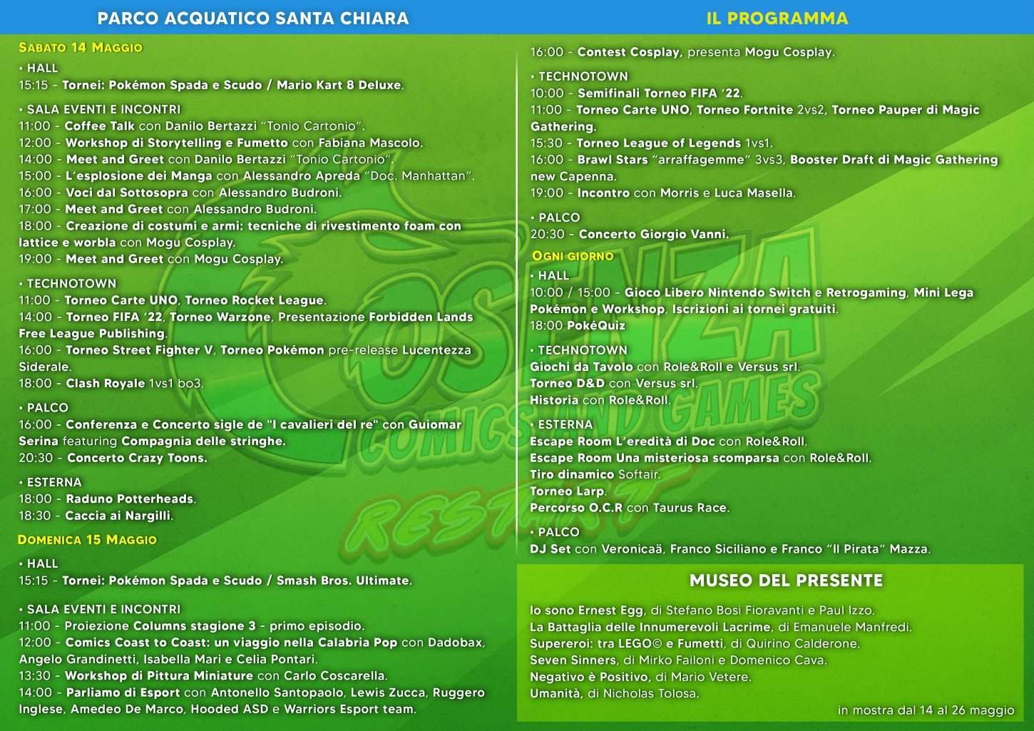 Il Parco Acquatico Santa Chiara di Rende (CS) ospiterà il festival, ovvero il cuore pulsante della manifestazione, con gli interventi degli ospiti, le conferenze, gli spettacoli musicali, i videogiochi e le attività di gioco all’aria aperta. Dalle 10:00 di mattina fino a sera.