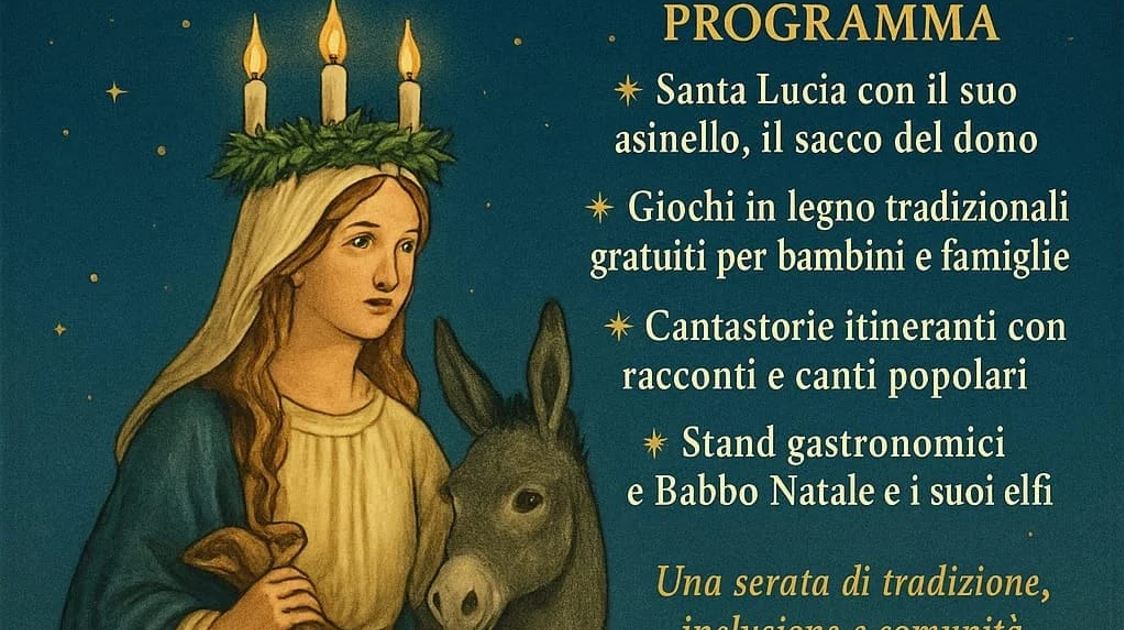 La serata sarà dedicata alla valorizzazione delle tradizioni legate a Santa Lucia e al Natale ormai prossimo, con una particolare attenzione ai temi dell’inclusione, della partecipazione e della condivisione comunitaria. Un appuntamento pensato per bambini, famiglie e cittadini di tutte le età, con attività gratuite e accessibili a tutti.