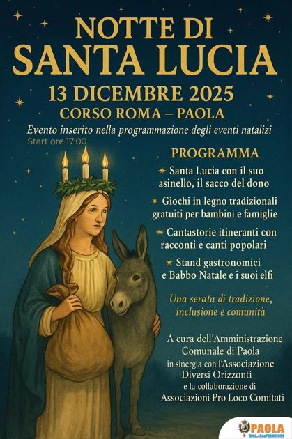 L’Amministrazione Comunale di Paola, in sinergia con l’Associazione Diversi Orizzonti e la collaborazione di Associazioni, proloco e comitati, promuove la I edizione della “Notte di Santa Lucia”, l’evento inserito nel programma Natalizio, che si terrà venerdì 13 dicembre dalle ore 17:00 lungo Corso Roma, nel cuore della città