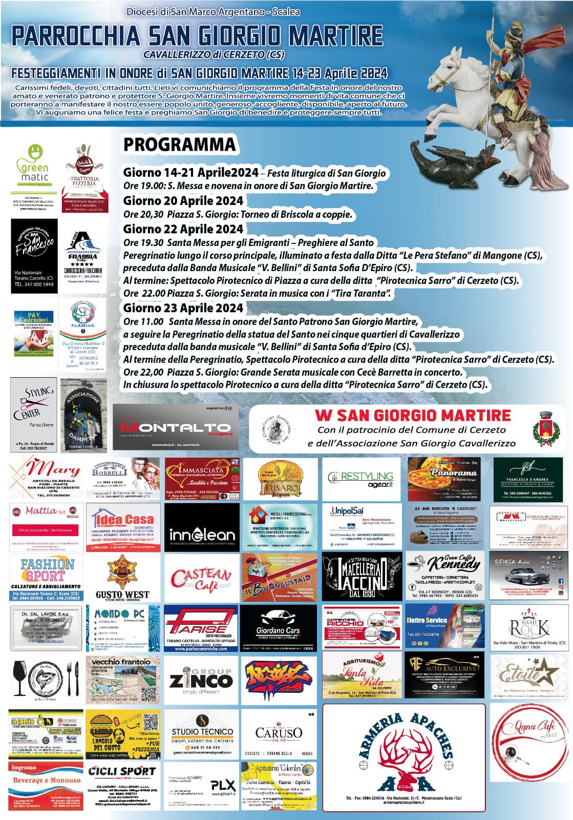Anche quest’anno Cavallerizzo si appresta ad onorare il ‘suo’ San Giorgio con un ricco programma festivo, che culminerĂ la sera del 23 aprile (dalle ore 21:00 in piazza San Giorgio) con il concerto gratuito del cantautore calabrese “Cecè Barretta”.