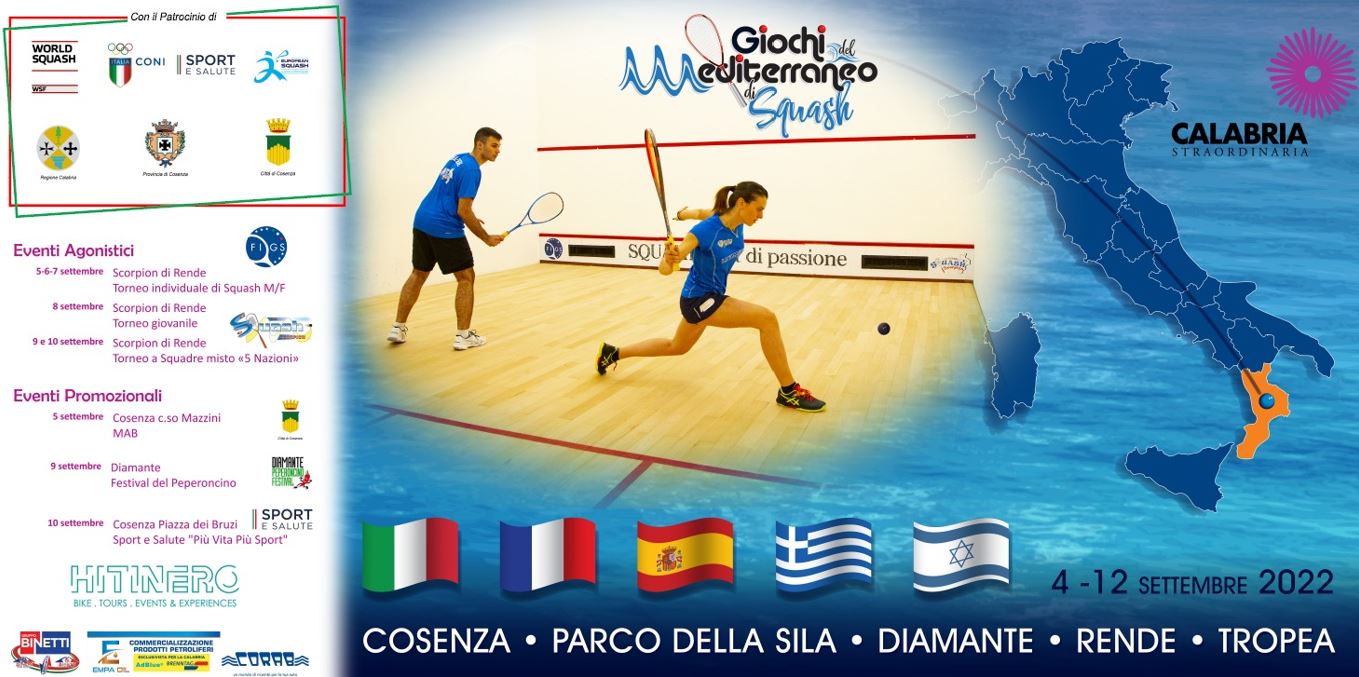 “Saranno Francia, Grecia, Israele e Spagna, oltre, chiaramente, ai padroni di casa dell’Italia, le nazioni protagoniste dei “Giochi del Mediterraneo di Squash”, in programma al Centro Sportivo Scorpion Health Club di Rende (CS), dal 5 al 10 di settembre 2022.