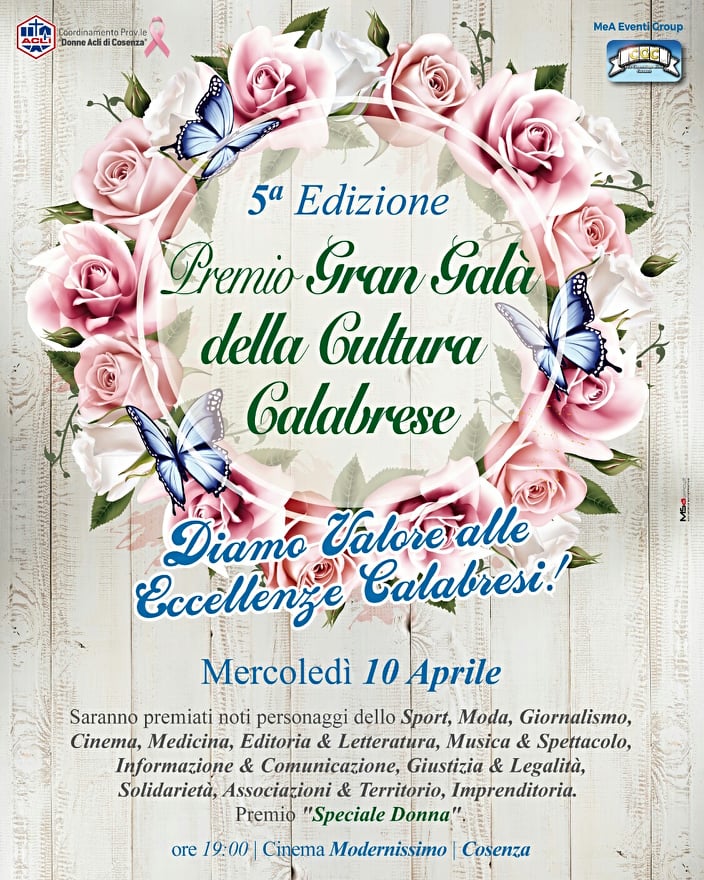 Torna a Cosenza il tradizionale appuntamento con il Gran Galà della Cultura Calabrese – già Premio Alarico -, l’evento ormai giunto alla V edizione organizzato dalla Mea Eventi Group di Roberto Zengaro, e quest’anno in partnership con il Coordinamento provinciale Donne Acli di Cosenza, rappresentato dalla responsabile Mariangela Caserta.