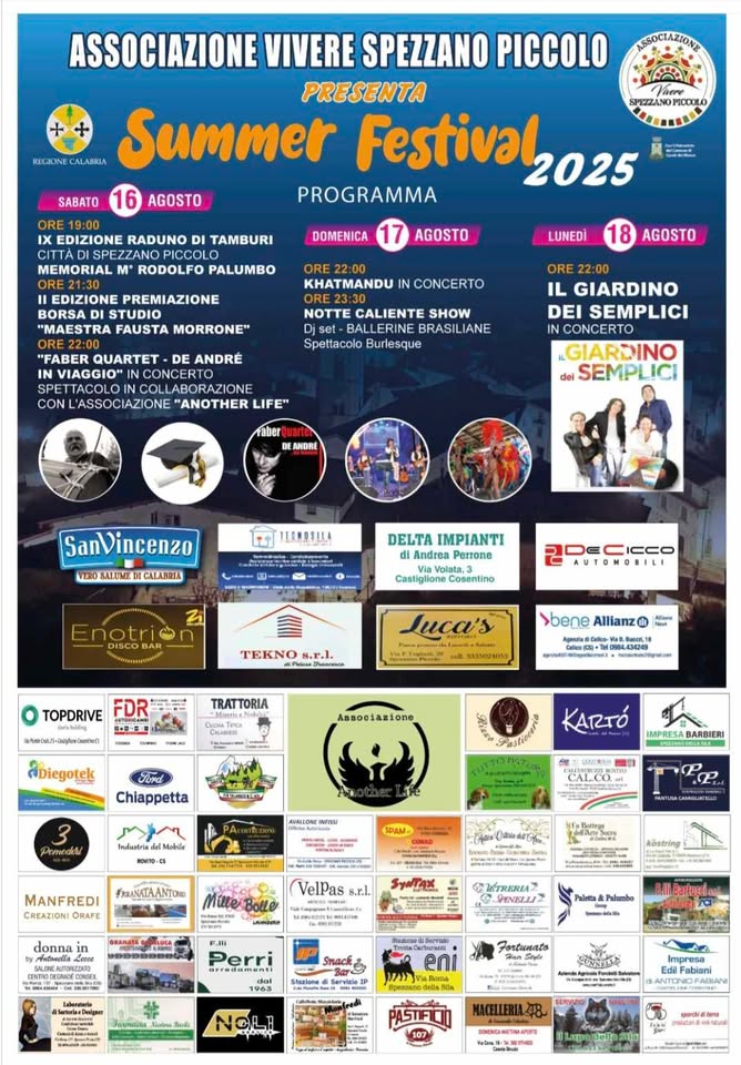 “Il «Spezzano Piccolo Summer Festival», organizzato dall’Associazione Vivere Spezzano Piccolo, è un evento comunitario arrivato alla IX edizione, che celebra tradizioni, gastronomia locale e il senso di appartenenza alla comunità di Spezzano Piccolo. Questi eventi, in calendario dal 16 al 18 agosto 2025, offrono un’ampia gamma di attività.