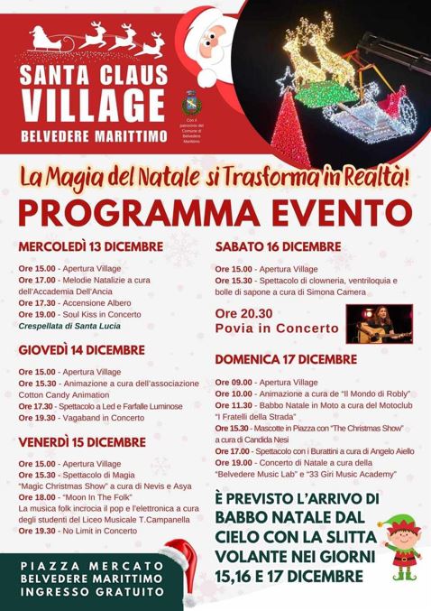 “Il vasto palinsesto di eventi promosso dagli organizzatori, grazie anche al patrocinio del comune di Belvedere Marittimo, vedrà quale location adibita, con ingresso gratuito, Piazza Mercato. La grande novità del 2023 è rappresentata dal concerto di Povia, Sabato 16 Dicembre, a testimonianza di come Belvedere Marittimo confermi la propria trazione per essere sede di grandi eventi, con ospiti tra i cantanti italiani più importanti. Le attrazioni natalizie inizieranno il 13 Dicembre con l’apertura del villagge prevista per le 15:00.