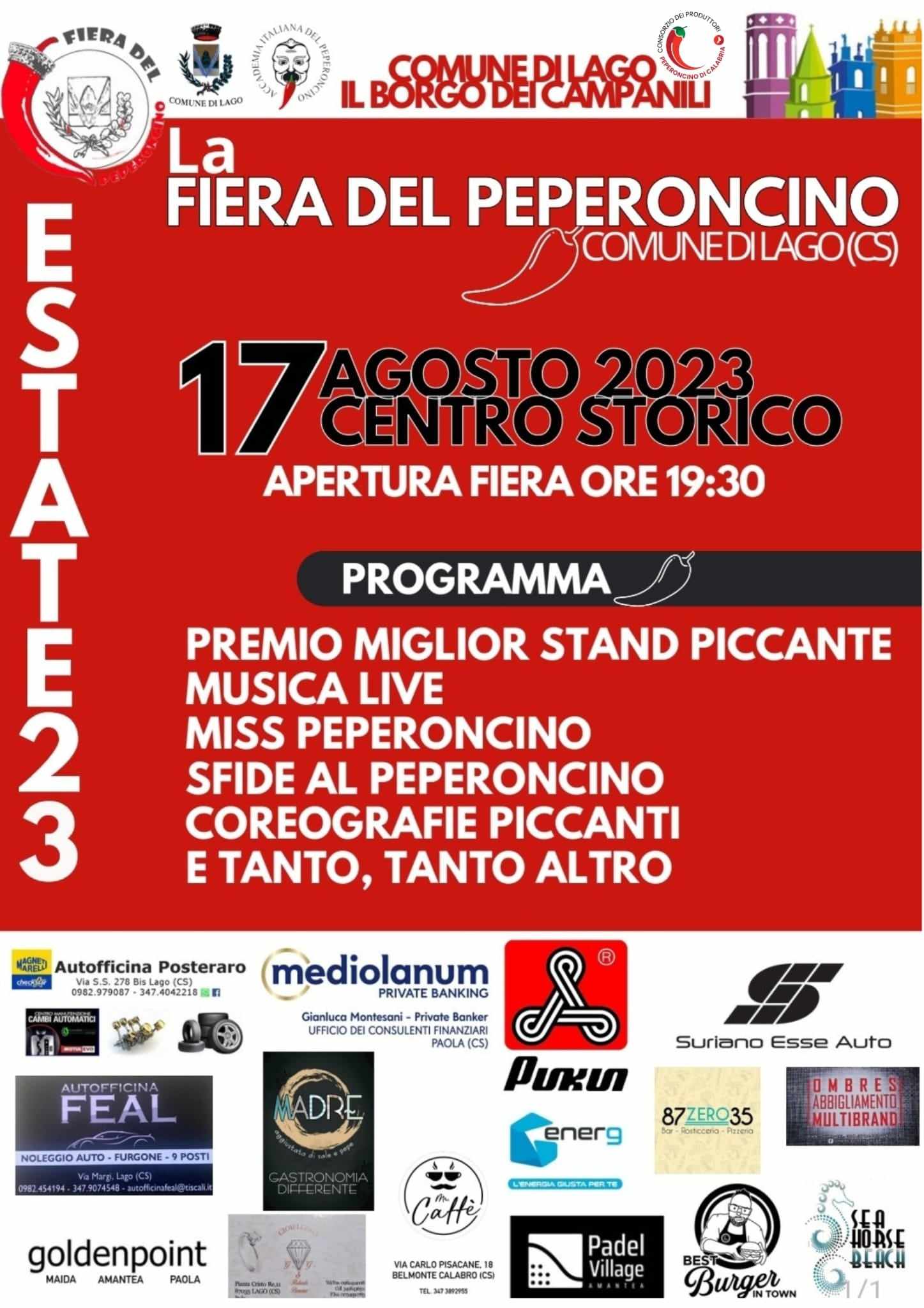 LAGO – Tutto pronto per la Fiera del Peperoncino di Lago, che si terrà il 17 Agosto nell’incantevole centro storico del comune della Provincia di Cosenza, amministrato dal sindaco Enzo Scanga. Un’edizione – quella del 2023 – che si preannuncia scoppiettante.