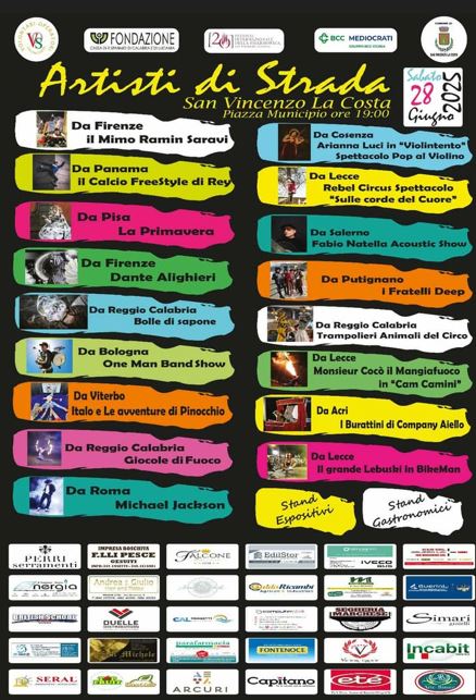 “Artisti di Strada” torna a San Vincenzo La Costa dopo un po’ di anni, dopo essere stato interrotto dal periodo del Covid. Torna però in gran stile con una carrellata di artisti provenienti da tutta Italia, dei veri artisti di strada che con i loro cappelli fanno piazze in tutto il mondo arriveranno proprio in mezzo a noi con la loro teatralità.
