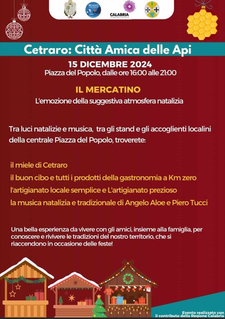 L’evento, con inizio alle h. 16:00, si articola in un programma che prevede:un mercatino di prodotti a base di miele, e in genere, della tradizione gastronomica e di prezioso artigianato locale, a Piazza del Popolo; musica natalizia e tradizionale, curata e a tratti remixata dai professionisti Angelo Aloe e Piero Tucci, che sapranno inserire anche brani pop, per un sano divertimento offerto alla città.