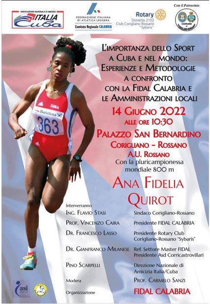 L’incontro dal titolo: “L’importanza dello Sport a Cuba e nel mondo: esperienze metodologiche a confronto con la Fidal Calabria e le Amministrazioni Locali” è stato fortemente voluto dalla Fidal Calabria, presieduta da Vincenzo Caira e dal Responsabile Settore Regionale Master in qualità di coordinatore dell’evento sportivo-culturale, Gianfranco Milanese. L’iniziativa ha subito trovato l’accoglienza dell’Amministrazione comunale di Corigliano-Rossano e del Sindaco, Flavio Stasi, e può contare sulla collaborazione del Rotary – Distretto 2102 – Club Corigliano Rossano – Sibaris e dall’Associazione Nazionale Amicizia Italia – Cuba.