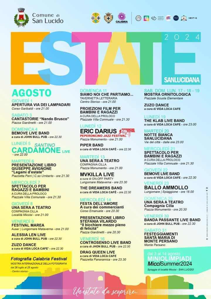 Le kermesse Arte in Vivo, Calabria fotografia Festival, Diatonik Festival sono eventi ormai affermati che di anno in anno stanno trovando la forza per innovarsi e coinvolgere oltre ogni più rosea aspettativa il pubblico. Spazio anche al Carnevale Estivo, che a breve sarà – data la grande importanza e risonanza mediatica – sarà presentato in pompa Magna quale evento di punta sul Tirreno Cosentino. Attesa inoltre per Santino Cardamone Live, per l’immancabile notte bianca, per Ballo ammollo allo Spiaggione di San Lucido.