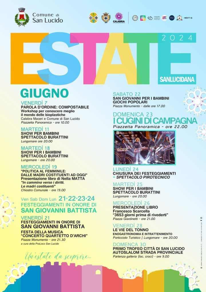 Il tutto tenendo conto dei parametri di bilancio comunale. L’estate sanlucidana punterà su organizzazioni di primissimo livello quali. I Solenni Festeggiamenti in onore di San Giovanni Battista saranno un momento di spicco dell’estate, grazie anche al concerto offerto dall’amministrazione comunale dei Cugini di Campana, previsto per il 23 Giugno nella Piazzetta panoramica.