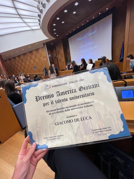 Mercoledì 18 Settembre ha avuto luogo una cerimonia ufficiale di premiazione a Roma presso la Camera dei Deputati, durante la quale il giovane Giacomo De Luca ha avuto l’onore di ricevere il “Premio America Giovani” al talento universitario conferito dalla fondazione Italia – Usa