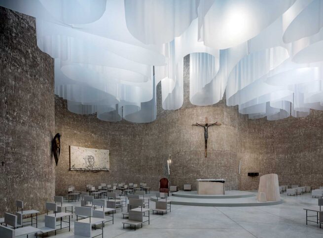 “Nel cuore del Parco del Pollino, è pronta la chiesa di Santa Maria Goretti, realizzata da Mario Cucinella Architects in collaborazione con l’artista Giuseppe Maraniello.