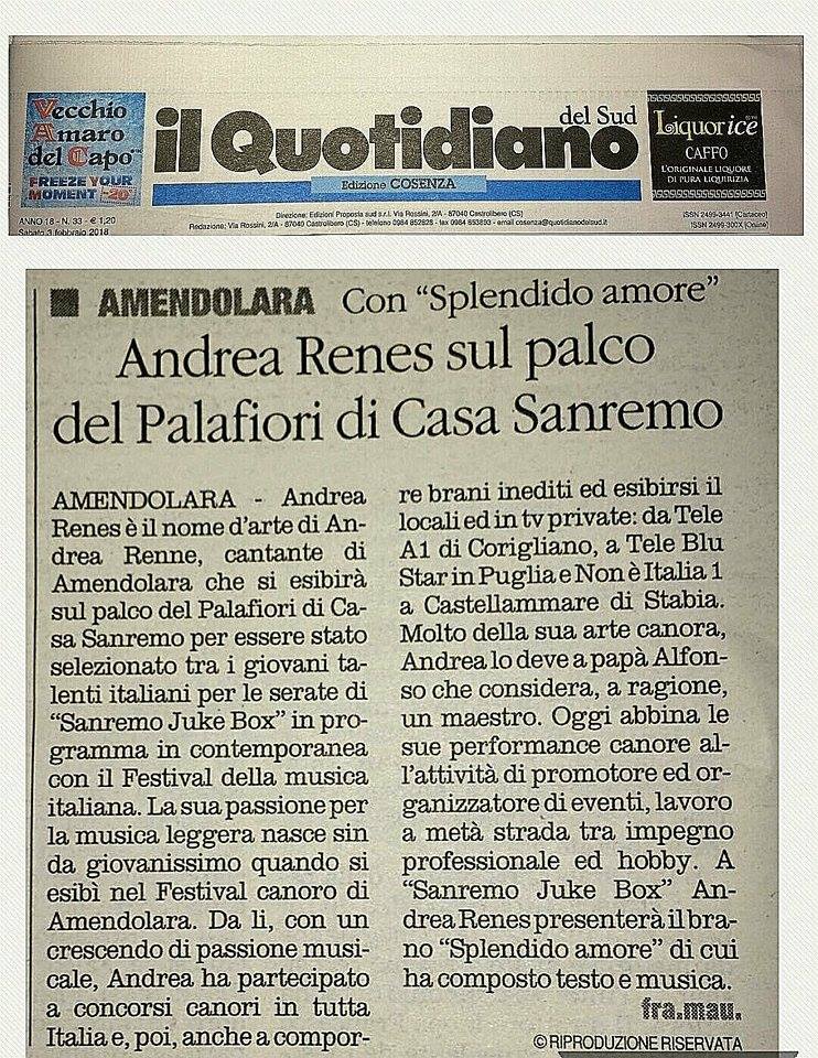 Andrea Renes, al secolo Andrea Renne, di Amendolara, sarà ospite il 7 febbraio a “Sanremo Juke Box”, evento partner di Casa Sanremo.