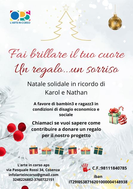 Il cuore pulsante di questa iniziativa è la consegna dei regali. Ogni classe adotterà uno o due piccoli destinatari, preparando con cura e affetto regali che saranno raccolti sotto l’”Albero della Solidarietà”. Il momento culminante sarà l’evento di consegna, che porterà un sorriso e un po’ di magia a chi, troppo spesso, vive nell’ombra delle difficoltà quotidiane. L’obiettivo è raddoppiare i sorrisi, e con l’aiuto di tutti, “L’Arte in Corso APS” mira a rendere questo Natale davvero speciale. La solidarietà coinvolge infatti anche altre scuole, tra cui l’Istituto Comprensivo Statale Gullo, l’Istituto Comprensivo Spirito Santo e l’Istituto Comprensivo di Mendicino che hanno deciso di sostenere “Fai brillare il tuo cuore: un regalo, un sorriso”.