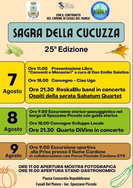 La Pro Loco di Casali del Manco e i Villaggi Silani APS, per tre giorni, in un tripudio di colori e profumi, tutto dedicato alla regina indiscussa dell’estate: la cucuzza