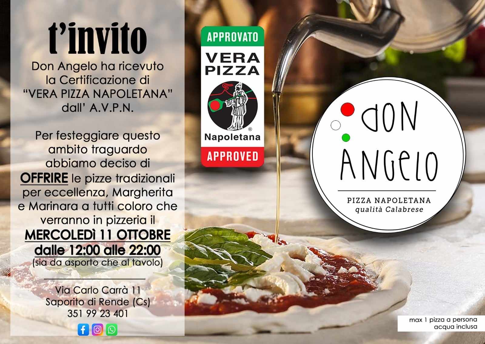 La Pizzeria Don Angelo di Rende riceve la certificazione di “Pizza Verace Napoletana” dall’A.V.P.N. e festeggia offrendola per un giorno intero