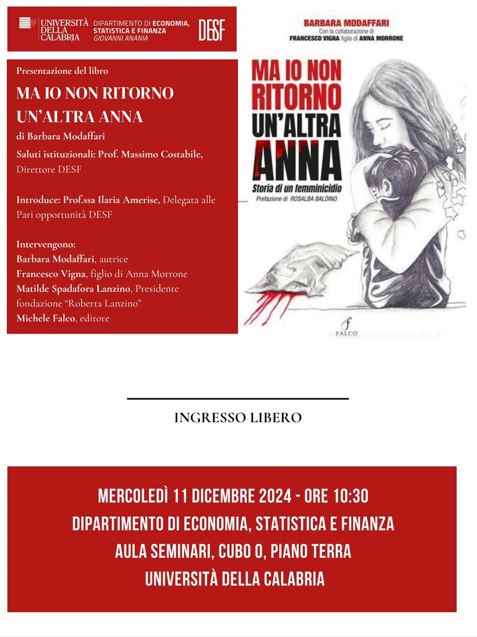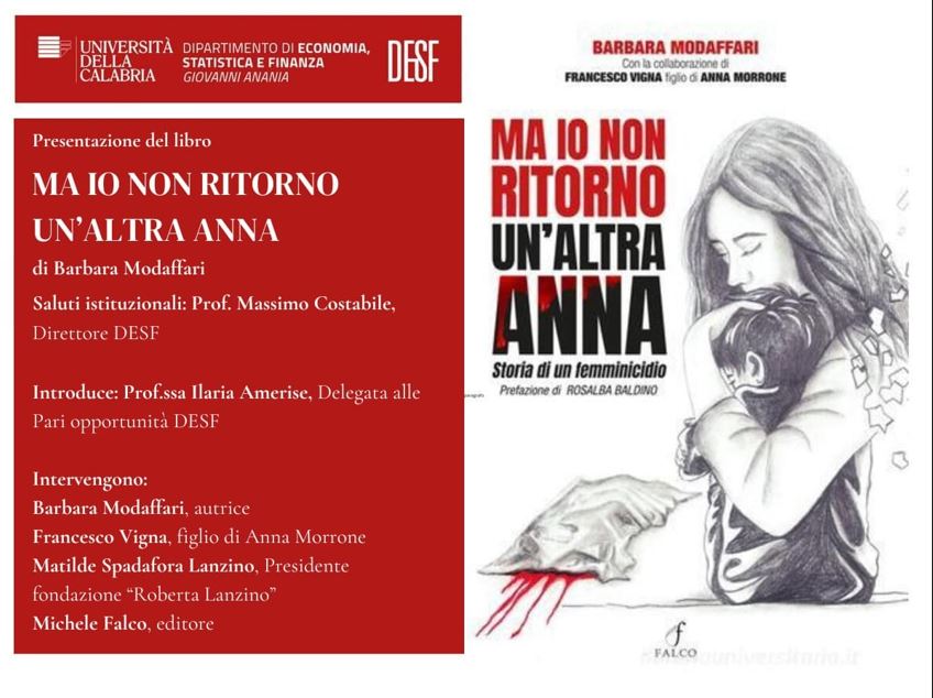 Il direttore del Dipartimento di Economia, Statistica e Finanza dell’ Unical, prof. Massimo Costabile e la delegata alle pari opportunità prof. Ilaria Amerise, nell’ ottica della lotta alla violenza di genere, ospiteranno la casa editrice Falco, con uno degli ultimi volumi stampati “Ma io non ritorno – Un’altra Anna”