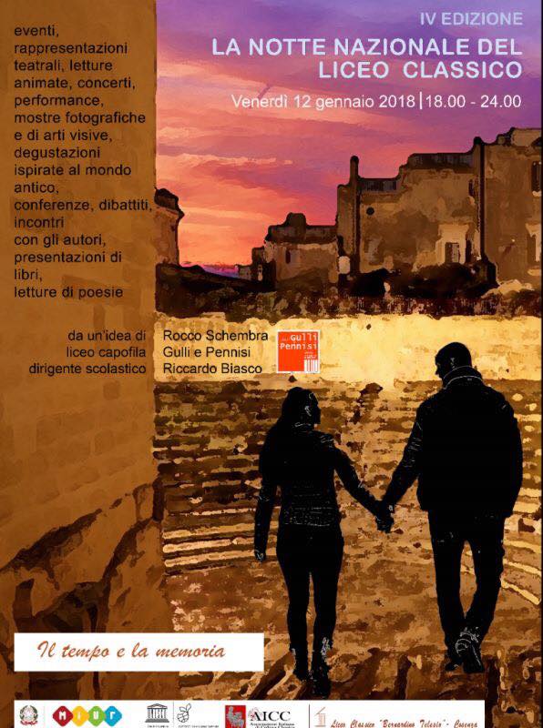 “Torna al Liceo Classico ‘B. Telesio’ di Cosenza la Notte Nazionale del Liceo Classico, in contemporanea con oltre 400 Licei sparsi in tutte le regioni italiane: appuntamento venerdì 12 gennaio dalle 18 alle 24 con letture di testi latini e greci e drammatizzazioni ispirate alla classicità ed una serie di ‘sorprese’ con le quali anche quest’anno il Liceo ‘Telesio’ stupirà ed incuriosirà la città in un affascinante percorso tra classicità e modernità.