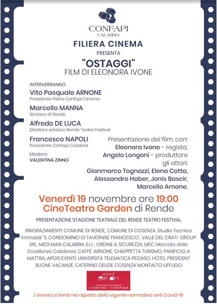 Venerdì 19 novembre 2021 alle ore 19 al CineTeatro Garden di Rende, Confapi Calabria Filiera Cinema presenta “Ostaggi”