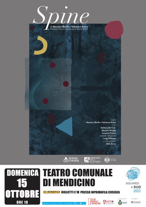 Mana Chuma, la compagnia diretta da Massimo Barilla e Salvatore Arena, racconta la storia contemporanea del Sud Italia. Spettacoli intesi come progetti di ricerca poetica e artistica finalizzati alla creazione di nuove forme di drammaturgia e teatro narrativo. Ricorrendo all’uso dell’italiano e del dialetto regionale, la compagnia realizza un’attenta ricerca sullo spazio e sulla sperimentazione di luoghi “altri” per il teatro. Lo spettacolo “Spine” che andrà in scena a Mendicino è finalista del Premio Ustica per il teatro 2003.